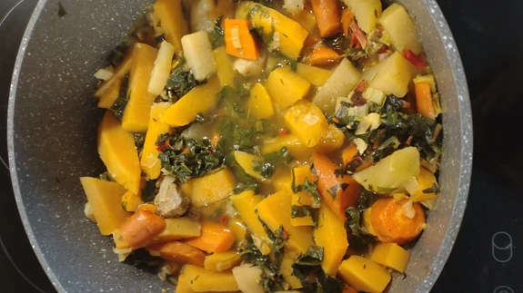 Kuumuta poti põhjas õli ja kuumuta köögiviljad klaasjaks. Lisa kuivatatud ürdid ja lisa nii palju vedelikku, et köögivili oleks kaetud. Hauta, kuni bataadid on pehmed.
