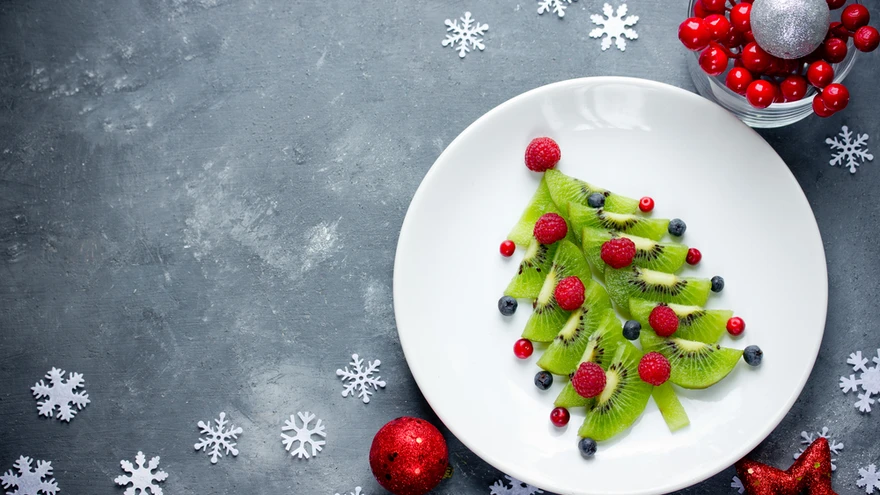 Pese ja koori kiivid ning lõika sektoriteks. Säti kuusekujuliselt taldrikule ja ehi kuusk marjadega.
