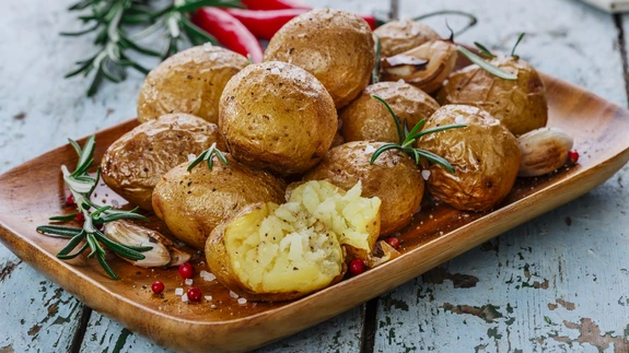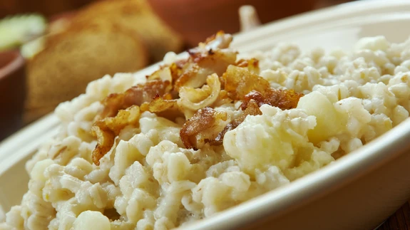 Haki sibul ja purusta või haki küüslauguküüs. Sega kausis kokku hakitud sibul, küüslauk ja riivjuust. Maitsesta soola ja pipraga. Viiluta keedetud kartulid.