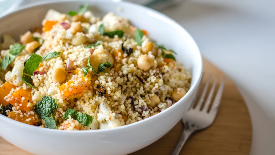 2. Vala kikerherned sõelale, loputa, nõruta ja sega kuskussiga. Lõika kurk väikesteks tükkideks. Koori apelsinid, eemalda valged kiled ja lõika sektorid tükkideks.